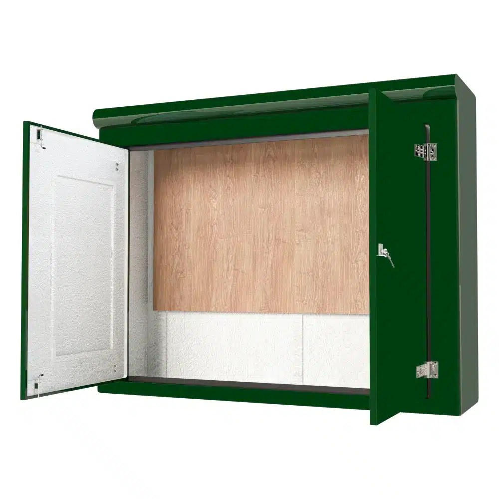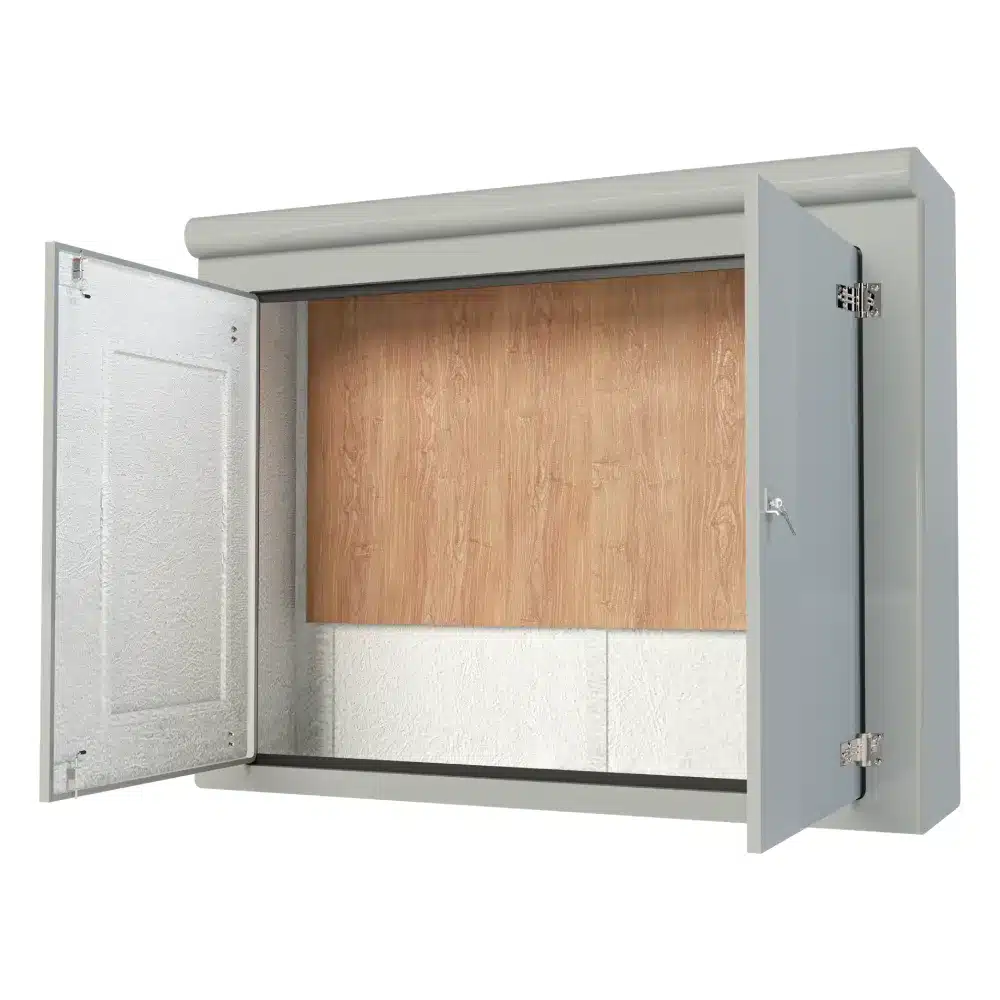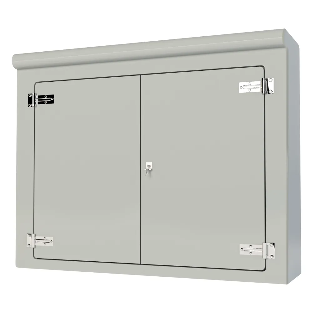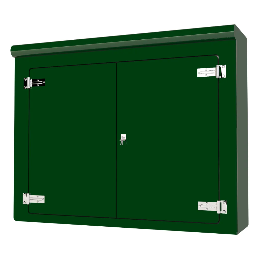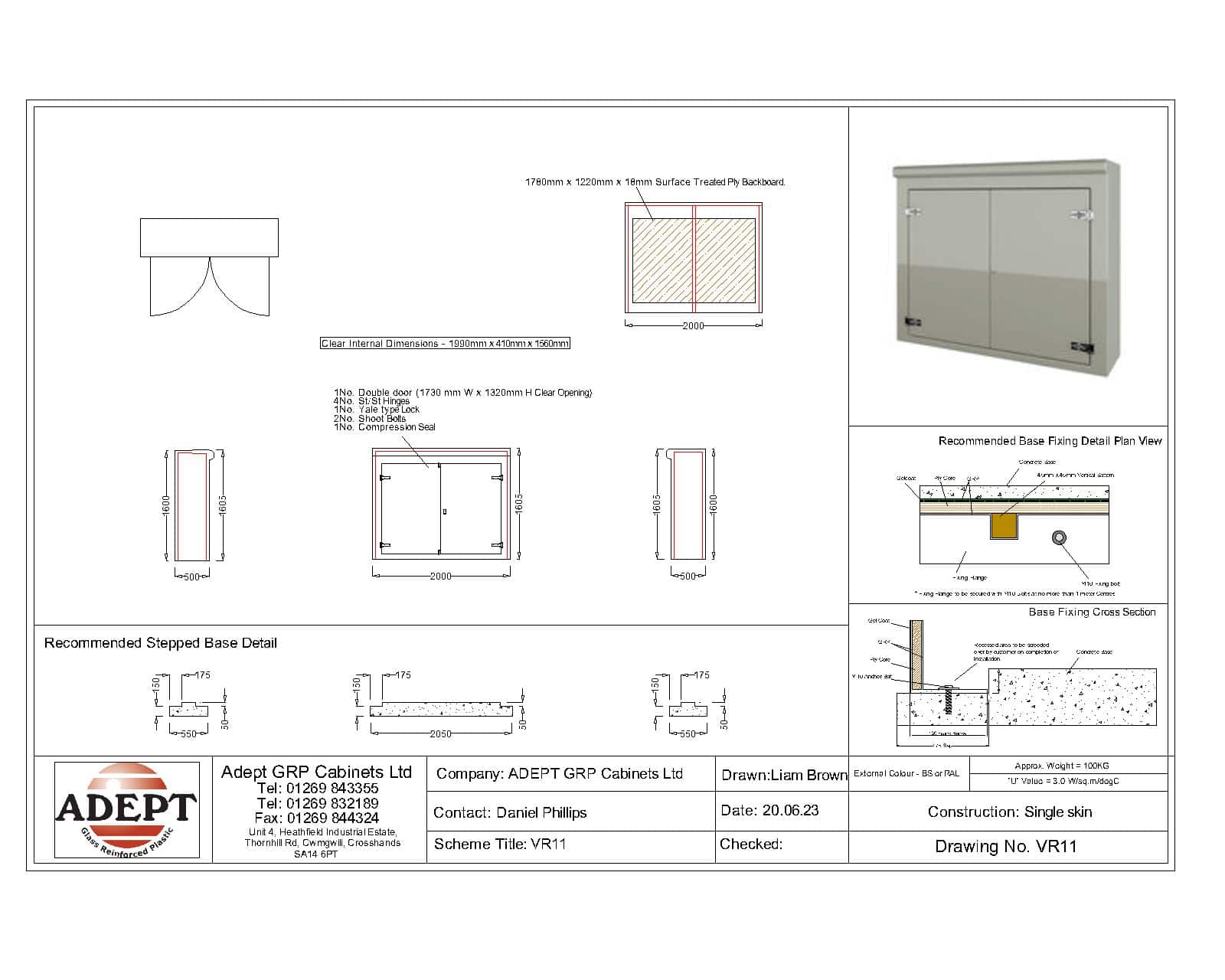 Our VR11 GRP Cabinet is available in Green (BS 14-C-39) and Grey (BS 10-A-05) as standard and is finished internally with a fire-retardant resin, it has a Single Skin Construction and comes complete with stainless steel hinges, security fixings, a cylinder nightlatch lock as well as a surface treated ply backboard, it has an open base c/w an internal fixing down flange for floor mounting. Delivery is normally made by National Carrier. Stock levels fluctuate daily so please contact us for a lead time if you require urgently.   April 2024: We have recently received a large number of orders for this product so lead time is approximately 5-6 weeks from order.