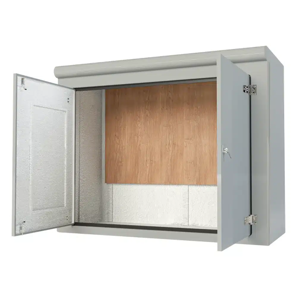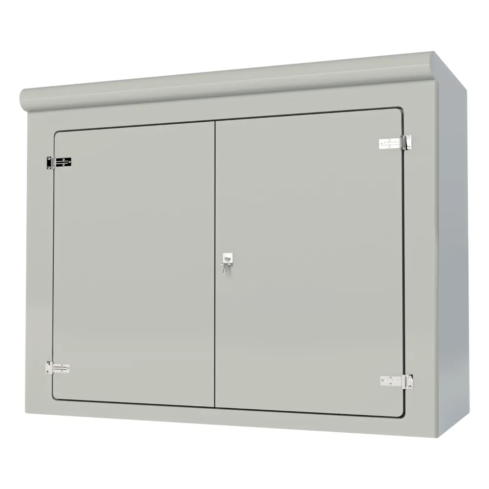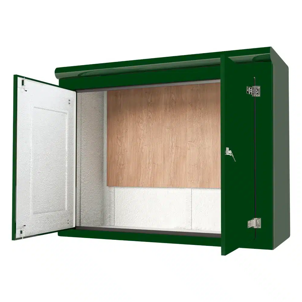Our VR12 GRP Cabinet is available in Green (BS 14-C-39) and Grey (BS 10-A-05) as standard and is finished internally with a fire-retardant resin, it has a Single Skin Construction and comes complete with stainless steel hinges, security fixings, a cylinder nightlatch lock as well as a surface treated ply backboard, it has an open base c/w an internal fixing down flange for floor mounting. Delivery is normally made by National Carrier. Stock levels fluctuate daily, please contact us for a lead time if you require urgently.   April 2024: We have recently received a large number of orders for this product so lead time is approximately 5-6 weeks from order.