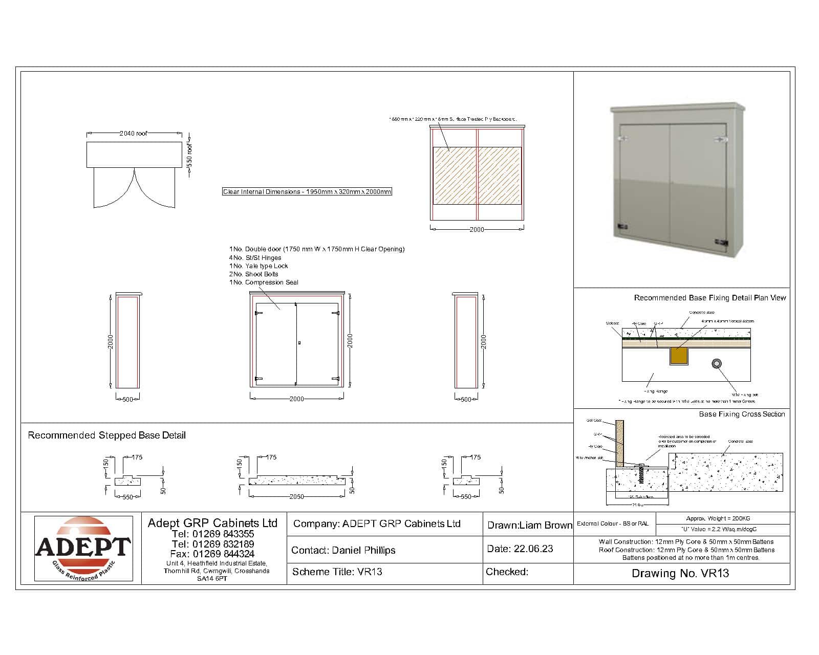 Our VR13 GRP Enclosure is available in Green (BS 14-C-39) and Grey (BS 10-A-05) as standard and is finished internally with a fire-retardant resin, it has a 12mm ply core encapsulated within the construction and comes complete with stainless steel hinges, security fixings, a cylinder nightlatch lock, hold open door stays and a surface treated ply backboard, it has an open base c/w an internal fixing down flange for floor mounting. Delivery by National Carrier (Mainland UK/south of Glasgow) is included in the purchase price, delivery is made by national carrier so a fork lift would be required for offloading purposes, if this is not possible, please contact us for a price to deliver and offload by Hiab. Approximate weight = 200kg Average lead time is about 4 weeks from order but stock levels fluctuate daily so please contact us regarding availability,  we will always endeavour to assist.