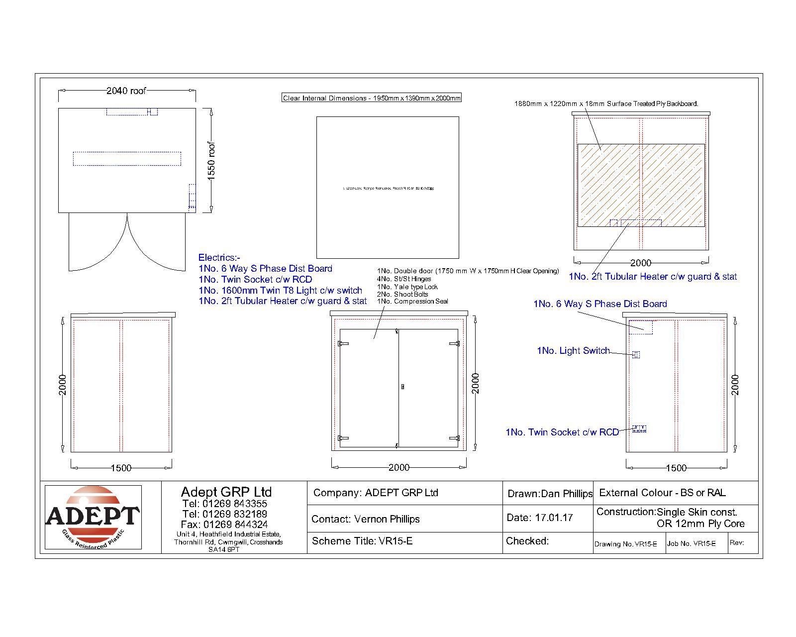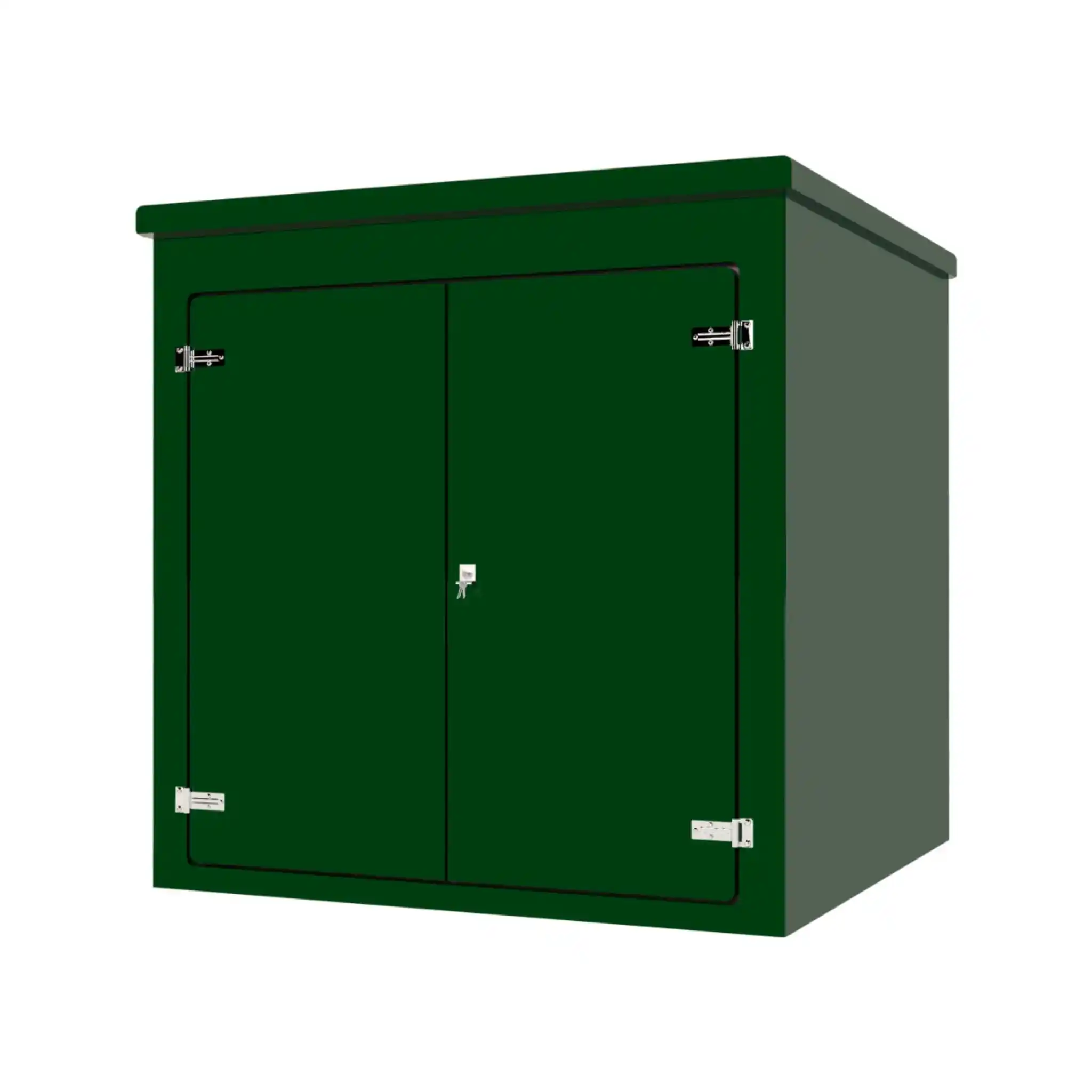 Our VR15-E GRP Enclosure is available in Green (BS 14-C-39) and Grey (BS 10-A-05) as standard and is finished internally with a fire-retardant resin, it has a 12mm ply core encapsulated within the construction and comes complete with stainless steel hinges, security fixings, a cylinder nightlatch lock, hold open door stays and a surface treated ply backboard, it has an open base c/w an internal fixing down flange for floor mounting. The “E” version of our VR15 also comes pre fitted with standard electrical fit out including a 6 way single phase distribution board, LED lighting, 13 double socket outlet and a 2kw convector heater c/w stat. Delivery by National Carrier (Mainland UK/south of Glasgow) is included in the purchase price, delivery is made by national carrier so a fork lift would be required for offloading purposes, if this is not possible, please contact us for a price to deliver and offload by Hiab. Approximate weight = 360kg Average lead time is about 5-6 weeks from order but stock levels fluctuate daily so please contact us regarding availability,  we will always endeavour to assist.
