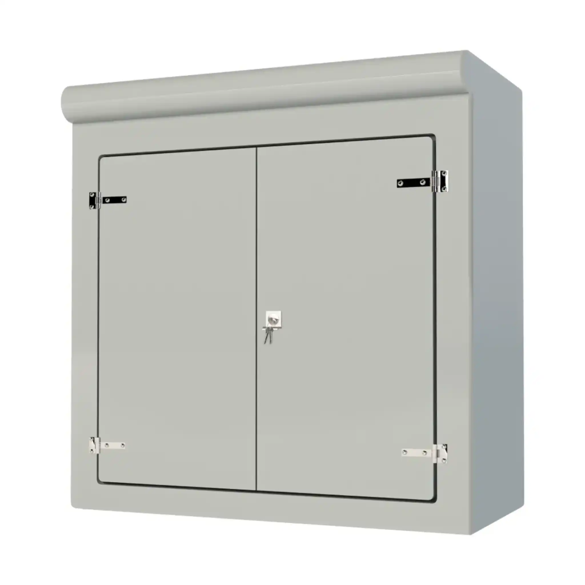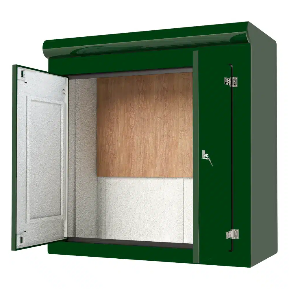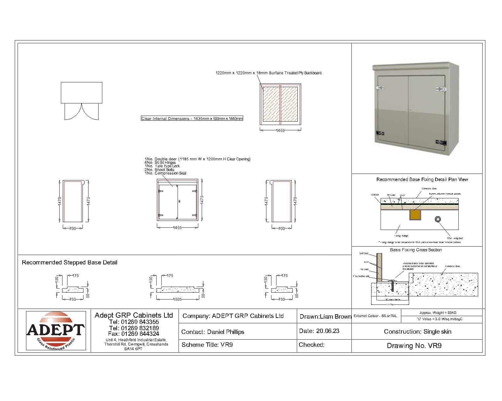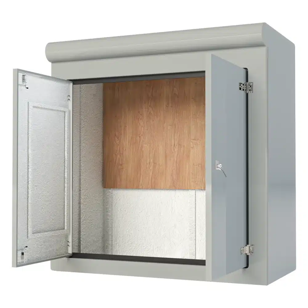 Our VR9 GRP Cabinet is available in Green (BS 14-C-39) and Grey (BS 10-A-05) as standard and is finished internally with a fire-retardant resin, it has a Single Skin Construction and comes complete with stainless steel hinges, security fixings, a cylinder nightlatch lock as well as a surface treated ply backboard, it has an open base c/w an internal fixing down flange for floor mounting. Delivery is normally made by National Carrier. Stock levels fluctuate daily so please contact us for a lead time if you require urgently.