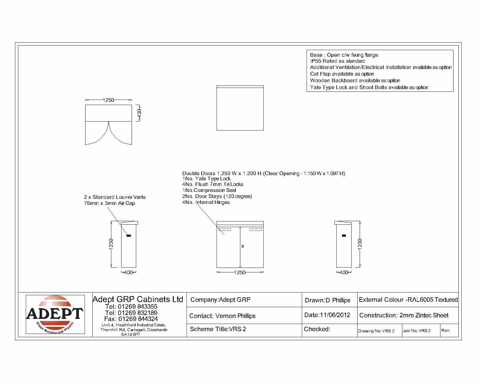 The VRS2 steel kiosk is manufactured from 1.5mm Zinetec sheet steel to BS EN 10152:2017 ZE 25/25. Our VRS steel kiosks provide excellent weather protection and sound earth continuity. The kiosks are press-framed, welded to give a rigid construction and manufactured to IP55 with certification to BS EN60529:1992 and A2:2023 (Category 2). The standard finish is a high quality texture in dark green (RAL 6005). All kiosks are fitted with lifting brackets, 14mm floor fixings, hold open door stays, night-latch lock, 7mm triangular key locks, a surface treated ply backboard and earthing points as standard. Delivery is normally made by National Carrier. Usually dispatched from stock but if your order is urgent, please contact us for an estimated delivery date.