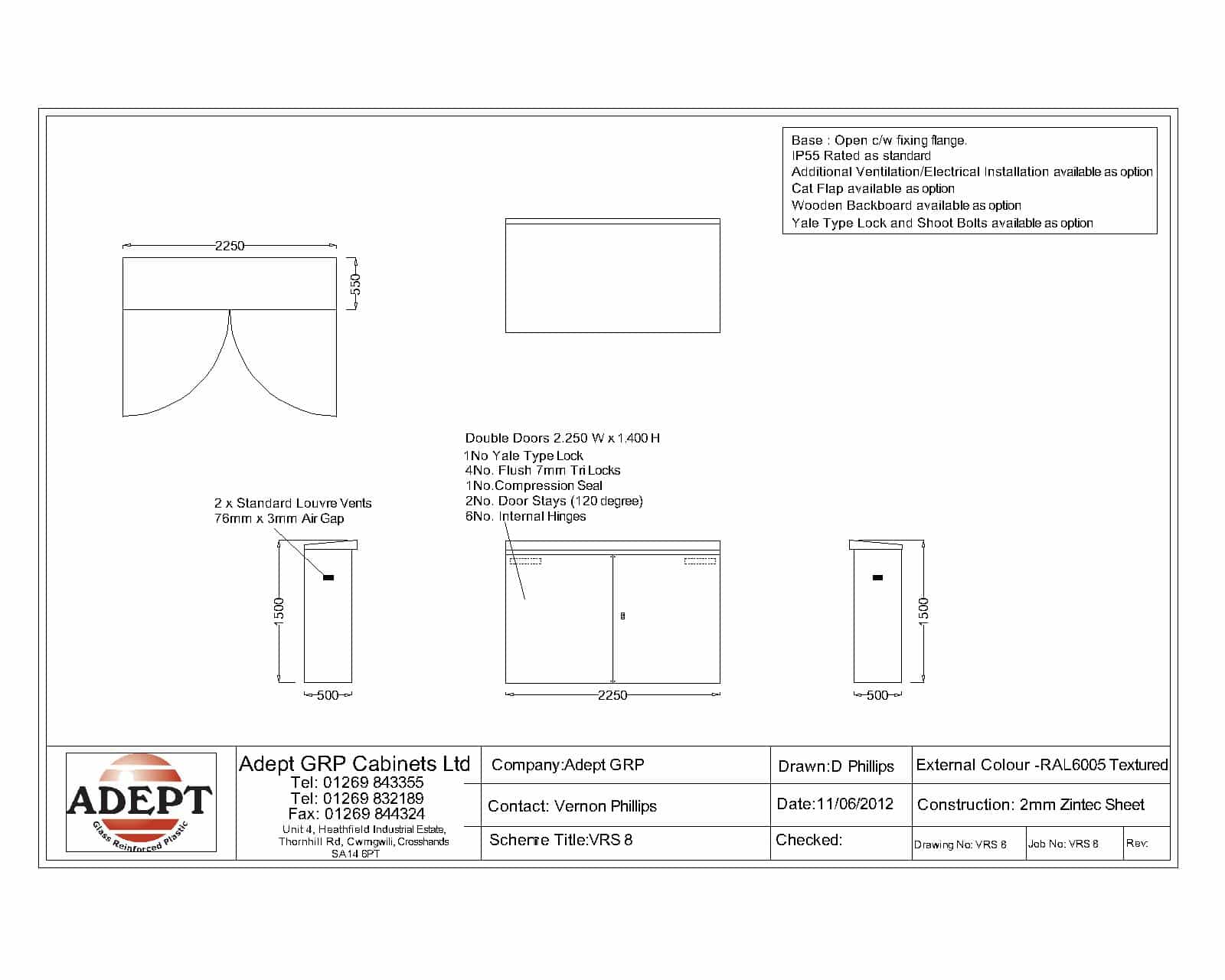 The VRS8 steel kiosk is manufactured from 2mm Zinetec sheet steel to BS EN 10152:2017 ZE 25/25. Our VRS steel kiosks provide excellent weather protection and sound earth continuity. The kiosks are press-framed, welded to give a rigid construction and manufactured to IP55 with certification to BS EN60529:1992 and A2:2023 (Category 2). The standard finish is a high quality texture in dark green (RAL 6005). All kiosks are fitted with lifting brackets, 14mm floor fixings, hold open door stays, night-latch lock, 7mm triangular key locks, a surface treated ply backboard and earthing points as standard. Delivery is normally made by National Carrier. Usual lead time is approximately 2-4 weeks from order, but if you require urgently please contact us and we will endeavour to assist.